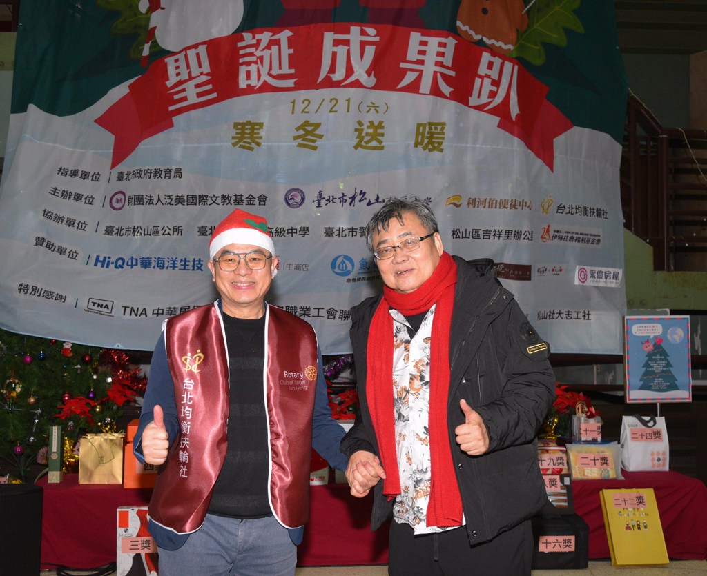 台北均衡扶輪社長蕭立智(圖左)和利河伯使徒中心王宏宜主任牧師,共同支持「松山之春」三合一公益活動。(松山社大提供)